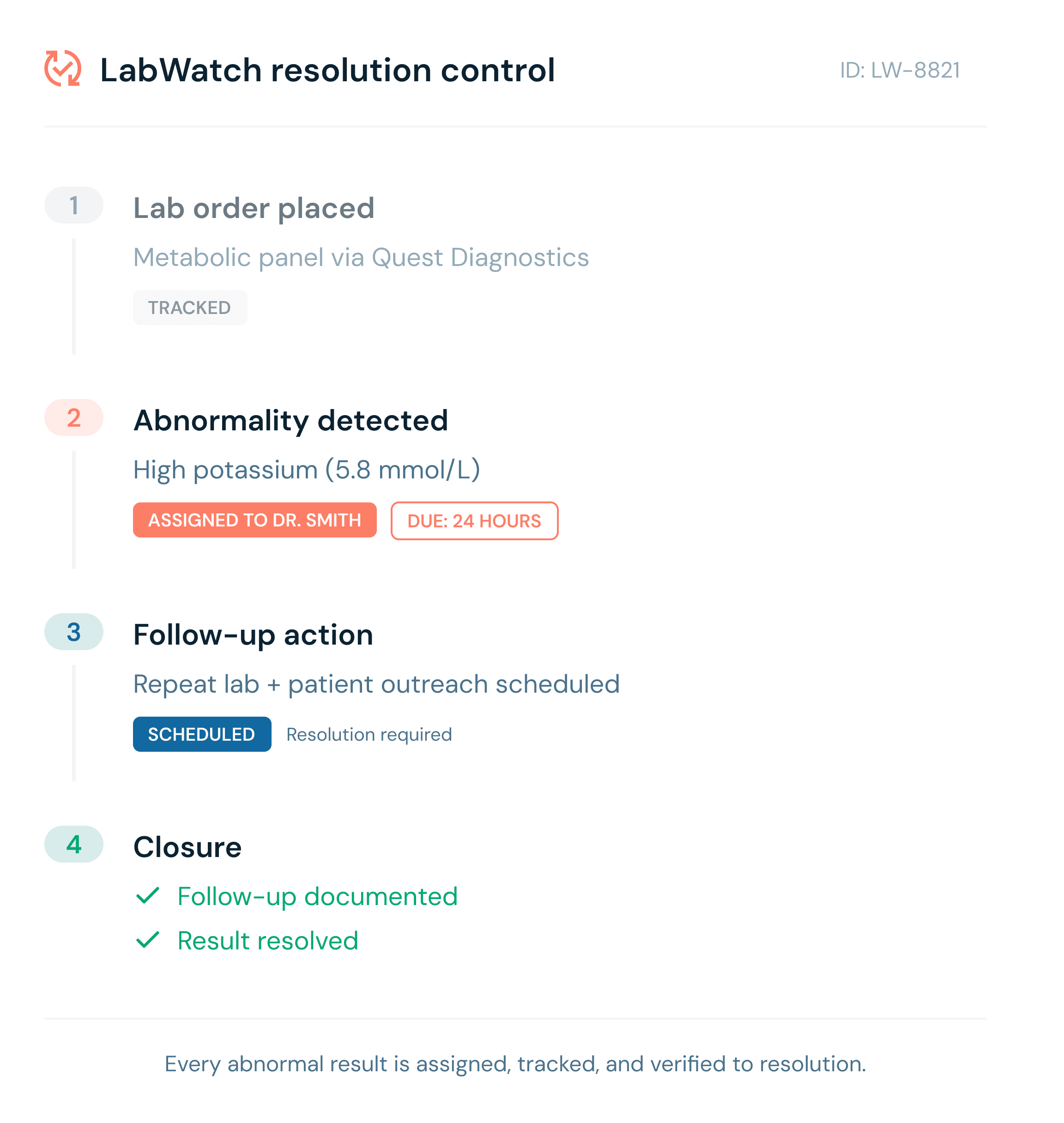 Tracks every abnormal lab to documented follow-up and closure.